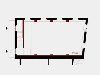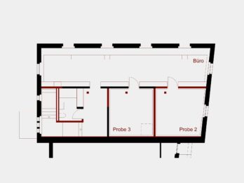 The rehearsal house is accessed through the space between it and the neighboring courtyard building of the “sogar theater”. One of the building’s entrances leads directly into the two-story rehearsal room. In contrast to the performance on exposed stages, the joint rehearsal will take place in a terrain trough. A new interior staircase with a separate building entrance leads to the upper floor. There two smaller rehearsal rooms will be arranged, which are shot over the office of the ZJO with extensive sheet music storage.